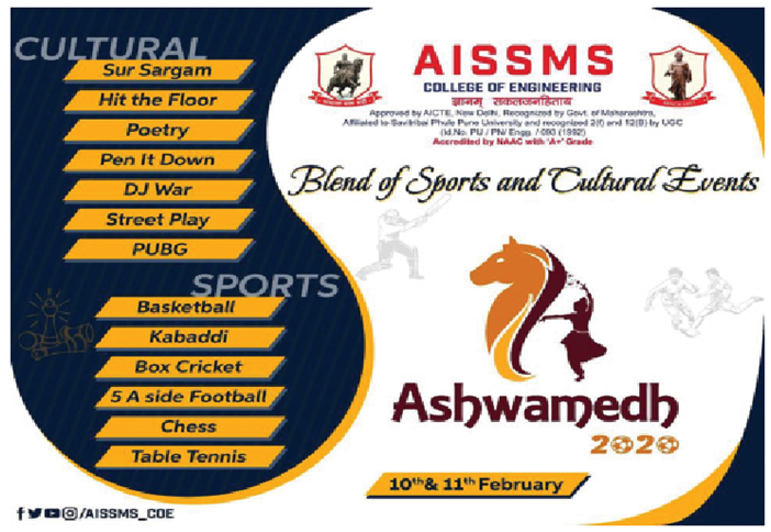 As a part of our continuous efforts in that direction, we organize an annual event “AISSMS COE Ashwamedh”, at our educational complex in Pune. The college students from all over the state are invited to exhibit their talents by participating in various competitions, viz. DJ War, Sur Sargam, Hit the Floor, Poetry, Pen it down, Street play, PUBG,5-A-Side Football, Kabbadi, Chess, Table tennis, Basket Ball, Box Cricket,etc. This time the “ASHWAMEDH” have been scheduled on 10th and 11th of February 2020. The event has successfully attracted almost 2000 students from various institutes. An event as such not only shapes up the overall development of the students, but also inculcates values such as sportsmanship. Along with academics, every student should involve into extra curriculum activities, which boosts their confidence and shapes their personality. We, on behalf of AISSMS College of Engineering, warm heartedly welcome you all to our one and only event “ASHWAMEDH”.