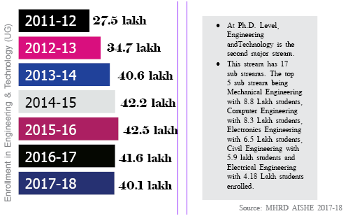 Engineering & Technology, according to the AISHE Report 2017-18, is the third major stream with an enrolment of over 40 lakh students in UG courses and 1.92 lakh students in PG courses. Though the stream has seen a slight decline in the last two years in student enrolments but if seen over a span of few years, it has only risen - from 27.5 lakh in 2012 to 40.1 lakh in 2018 in UG courses and 1.45 lakh in 2012 to almost 2 lakh in 2018 in PG courses.