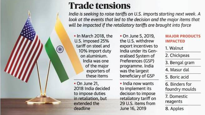 - Also recently US withdrew the Generalised System of Preferences (GSP) benefits provided to India following which India has now decided to impose retaliatory tariffs on US products.