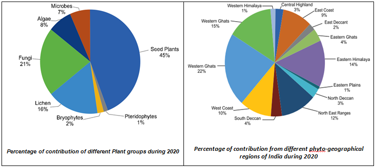 - With these new discoveries the latest estimate of plant diversity in India stands at 54,733 taxa including 21,849 angiosperms, 82 gymnosperms, 1310 Pteridophytes, 2791 bryophytes, 2961 lichens, 15,504 fungi, 8979 algae and 1257 microbes.