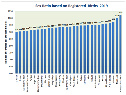 - The lowest SRB was reported by Gujarat (901), Assam (903) and Madhya Pradesh (905), followed by Jammu & Kashmir (909).