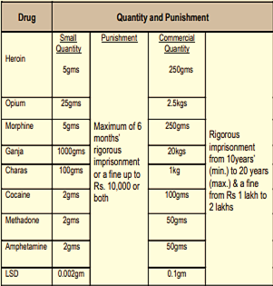 - Punishment prescribed under the NDPS Act is based on the quantity of drugs seized. Following amendments, it “grades punishment into three categories depending on the quantity of drugs seized and also provides for judicial discretion as far as the severity of punishment is concerned".