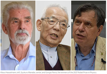 The Nobel Prize in Physics 2021 was awarded "for groundbreaking contributions to our understanding of complex systems" with one half jointly to Syukuro Manabe (Japan) and Klaus Hasselmann (Germany) "for the physical modelling of Earth's climate, quantifying variability and reliably predicting global warming" and the other half to Giorgio Parisi (Italy) "for the discovery of the interplay of disorder and fluctuations in physical systems from atomic to planetary scales."