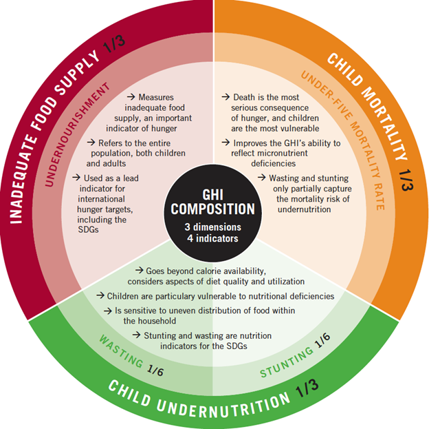 - Based on the values of the four indicators the GHI determines hunger on a 100-point scale, where 0 is the best possible score (no hunger) and 100 is the worst.