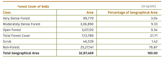- 17 states/UT’s have above 33 Percent of the Geographical Area Under Forest Cover: Out of these states and UT’s, five states/UTs namely Lakshadweep, Mizoram, Andaman & Nicobar Islands, Arunachal Pradesh and Meghalaya have more than 75 per cent forest cover while 12 states/UTs namely Manipur, Nagaland, Tripura, Goa, Kerala, Sikkim, Uttarakhand, Chhattisgarh, Dadra & Nagar Haveli and Daman & Diu, Assam, Odisha, have forest cover between 33 per cent to 75 per cent.