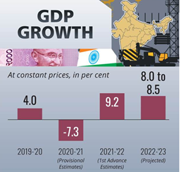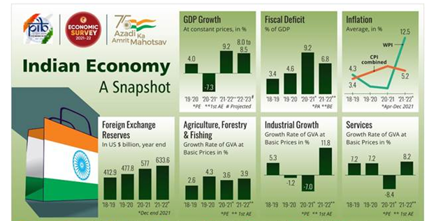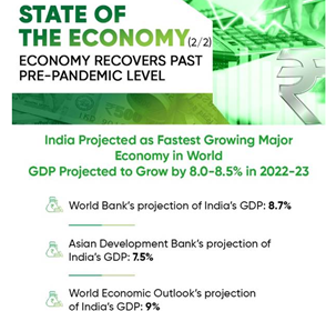 - The Survey says, the above projection is comparable with the World Bank’s and Asian Development Bank’s latest forecasts of real GDP growth of 8.7 per cent and 7.5 per cent respectively for 2022-23. As per the IMF’s latest World Economic Outlook (WEO) growth projections released on 25th January, 2022, India’s real GDP is projected to grow at 9 per cent in both 2021-22 and 2022-23 and at 7.1 per cent in 2023-24. This projects India as the fastest growing major economy in the world in all these three years.