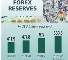 - Further, the Survey points out that despite all the disruptions caused by the global pandemic, India’s balance of payments remained in surplus throughout the last two years. This allowed the Reserve Bank of India to keep accumulating foreign exchange reserves, which stand at US$634 billion on 31st December 2021. This is equivalent to 13.2 months of imports and higher than the country’s external debt.