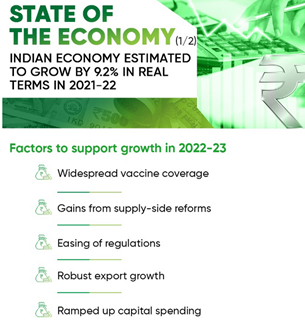 - Referring to First Advance Estimates, the Survey states that the Indian economy is estimated to grow by 9.2 per cent in real terms in 2021-22, after a contraction of 7.3 per cent in 2020-21. This implies that overall economic activity has recovered past the pre-pandemic levels. Almost all indicators show that the economic impact of the “second wave” in Q1 was much smaller than that experienced during the full lockdown phase in 2020-21, even though the health impact was more severe.