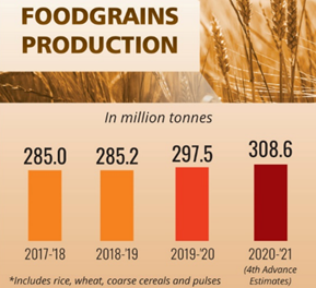 - The Survey states that Agriculture and allied sectors have been the least impacted by the pandemic and the sector is expected to grow by 3.9 per cent in 2021-22 after growing by 3.6 per cent in the previous year. The area sown under Kharif and Rabi crops, and the production of wheat and rice has been steadily increasing over the years. In the current year, food grains production for the Kharif season is estimated to post a record level of 150.5 million tonnes. Moreover, procurement of food grains under the central pool accordingly maintained its rising trend in 2021-22 along with minimum support prices, which augur well for national food security and farmers’ incomes. Importantly, the strong performance of the sector was supported by Government policies that ensured timely supplies of seed and fertilizers despite pandemic related disruptions. It was helped by good monsoon rains as reflected in reservoir levels being higher than the 10-year average.
