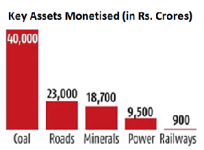 - The roads and highways sector monetised assets worth Rs. 23,000 crore, power sector garnered Rs.9,500 crore, coal mining generated Rs. 40,000 crore and mining of minerals fetched Rs. 18,700 crore, and railways added Rs. 900 crore.