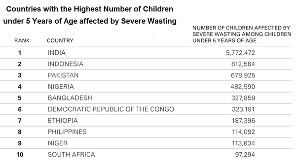 - According to the Report, India has 5,772,472 children below five years affected by severe wasting — the most in the world.
