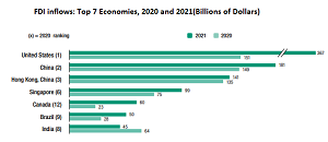 - While the United States ($367 billion) remained the top recipient of FDI, China ($181 billion) and Hong Kong ($141 billion) also retained second and third position respectively.
