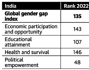 - India has been ranked 135 out of 146 countries in the World Economic Forum's Gender Gap Report 2022.