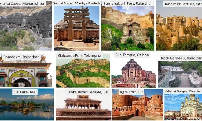 - ये स्थल हैं- अजंता गुफाएं (महाराष्ट्र), सांची स्तूप (मध्य प्रदेश), कुंभलगढ़ किला (राजस्थान), जैसलमेर किला (राजस्थान), रामदेवरा, जैसलमेर (राजस्थान), गोलकुंडा फोर्ट, हैदराबाद (तेलंगाना), सूर्य मंदिर, कोणार्क (ओडिशा), रॉक गार्डन (चंडीगढ़), डल झील, श्रीनगर (जम्मू और कश्मीर), बांके बिहारी मंदिर, मथुरा (उत्तर प्रदेश), आगरा का किला, आगरा (उत्तर प्रदेश) तथा कालीघाट मंदिर (पश्चिम बंगाल)।