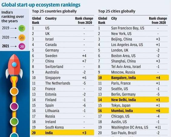 स्टार्टअप इकोसिस्टम मैप और रिसर्च सेंटर 'स्टार्टअप ब्लिंक' द्वारा जून 2021 में 'ग्लोबल स्टार्टअप इकोसिस्टम इंडेक्स 2021' (Global Startup Ecosystem Index 2021) जारी किया गया।