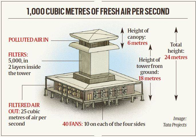- प्रदूषित हवा को 24 मीटर की ऊंचाई पर अवशोषित किया जाता है और फिल्टर की गई हवा को टावर के नीचे, जमीन से लगभग 10 मीटर की ऊंचाई पर छोड़ा जाता है।