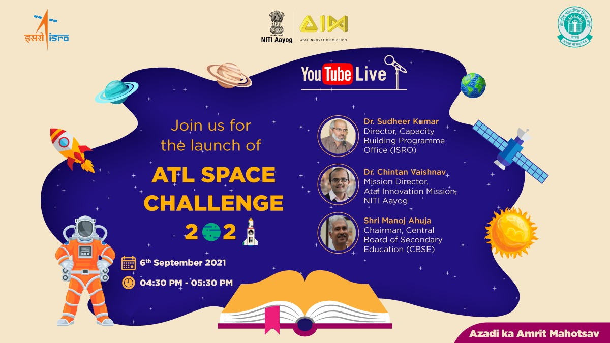 अटल इनोवेशन मिशन (एआईएम), नीति आयोग ने 6 सितंबर, 2021 को भारतीय अंतरिक्ष अनुसंधान संगठन (इसरो) और केन्द्रीय माध्यमिक शिक्षा बोर्ड के साथ मिलकर देश के सभी स्कूलों के छात्रों के लिए ‘एटीएल स्पेस चैलेंज 2021’ (ATL Space Challenge 2021) लॉन्च किया।
