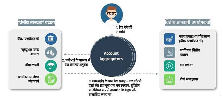 - भारतीय रिजर्व बैंक के अनुसार, एक अकाउंट एग्रीगेटर एक गैर-बैंकिंग वित्तीय कंपनी है, जो एक अनुबंध के तहत, अपने ग्राहक से संबंधित वित्तीय जानकारी को सुरक्षित और डिजिटल रूप में अकाउंट एग्रीगेटर में शामिल किसी अन्य विनियमित वित्तीय संस्थान के साथ साझा करने में मदद करती है।