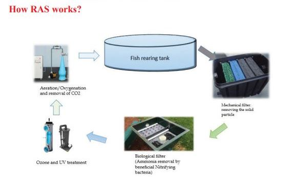 महत्वपूर्ण तथ्य: रीसर्क्युलेटरी एक्वाकल्चर सिस्टम (आरएएस) एक ऐसी तकनीक है, जहां यांत्रिक और जैविक निस्पंदन तथा निलंबित पदार्थ और मेटाबोलाइट्स को हटाने के बाद पानी का पुनर्नवीनीकरण और पुन: उपयोग किया जाता है।