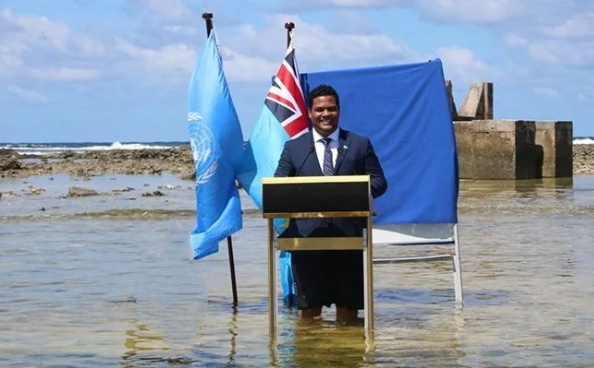 तुवालु के विदेश मंत्री साइमन कोफे ने 5 नवंबर, 2021 को समुद्र में खड़े होकर जलवायु परिवर्तन पर 'संयुक्त राष्ट्र जलवायु शिखर सम्मेलन कॉप-26' को संबोधित किया।