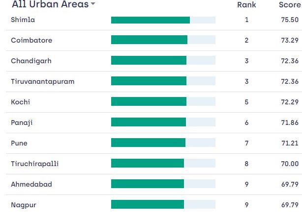 - सूचकांक में शिमला प्रथम स्थान पर, इसके बाद कोयंबटूर दूसरे और चंडीगढ़ तीसरे स्थान पर है। सूचकांक में सबसे निचले 56वें स्थान पर धनबाद है, इसके अलावा मेरठ 55वें, तथा ईटानगर 54वें स्थान पर है।
