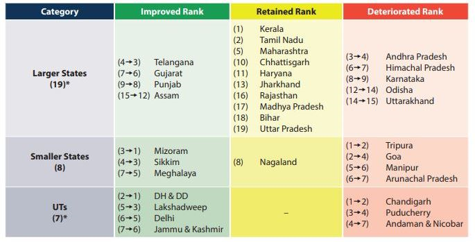 - दिल्ली और जम्मू और कश्मीर समग्र प्रदर्शन में केंद्र-शासित प्रदेशों में सबसे निचले स्थान पर रहे, लेकिन वृद्धिशील प्रदर्शन में सूची में सबसे ऊपर थे।