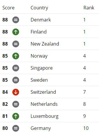 - डेनमार्क, फिनलैंड, न्यूजीलैंड और नॉर्वे उच्चतम स्कोर के साथ सूची में सबसे ऊपर हैं।