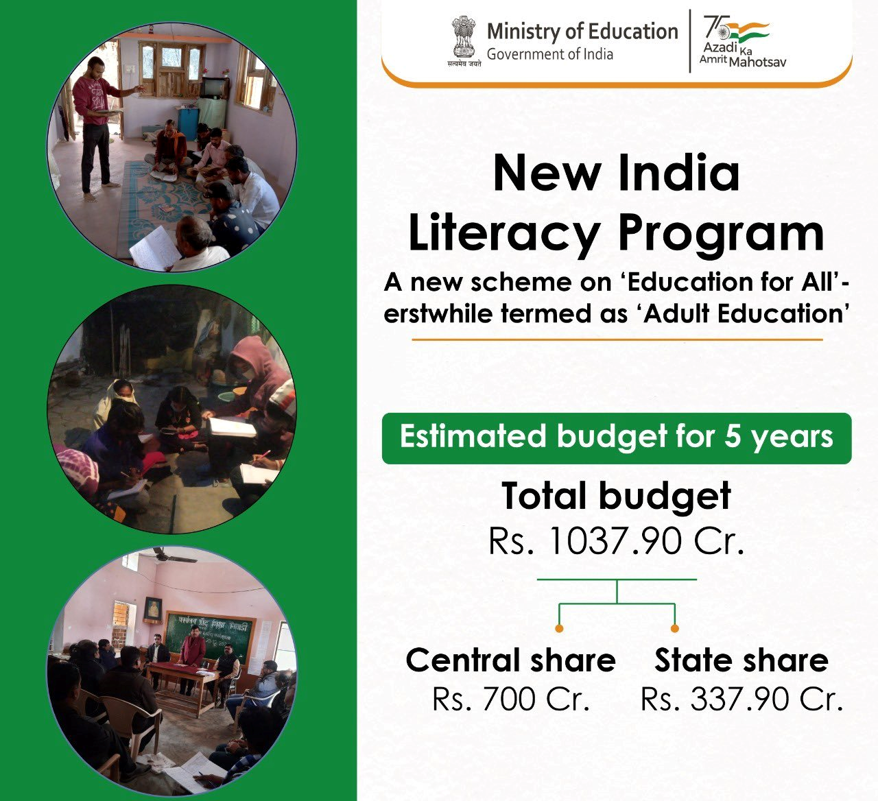 - नव भारत साक्षरता कार्यक्रम का अनुमानित कुल परिव्यय 1037.90 करोड़ रुपये है।