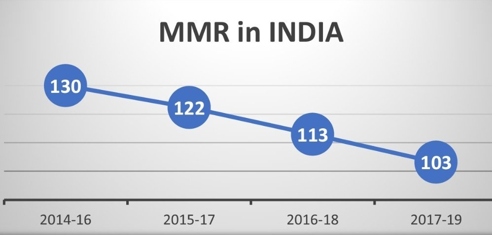 - भारत 2020 तक 100/लाख जीवित जन्म के राष्ट्रीय स्वास्थ्य नीति के MMR लक्ष्य को हासिल करने और 2030 तक निश्चित रूप से 70/ लाख जीवित जन्म के सतत विकास लक्ष्य को प्राप्त करने के मार्ग पर अग्रसर है।