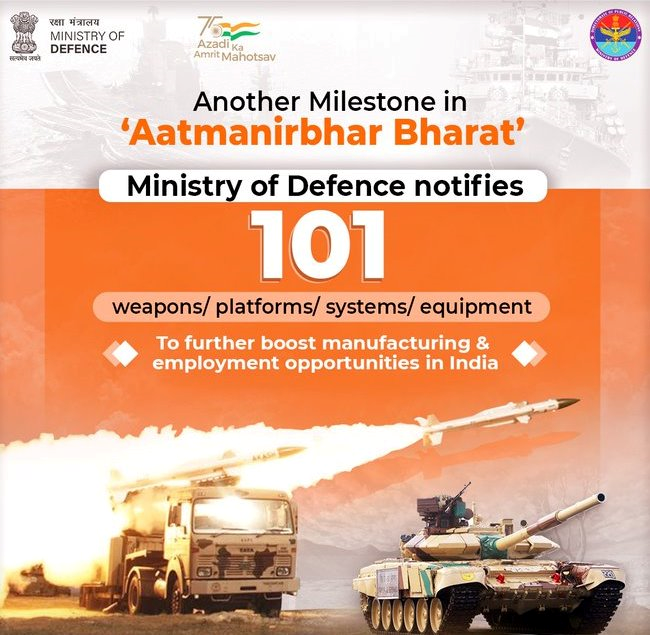 रक्षा मंत्री राजनाथ सिंह ने 7 अप्रैल, 2022 को 101 वस्तुओं की तीसरी सकारात्मक स्वदेशीकरण सूची (Third positive indigenisation list) जारी की, जिसमें प्रमुख हथियार/प्रणाली/उपकरण/प्लेटफॉर्म शामिल हैं।