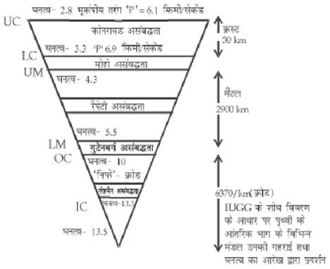 उत्तर : पृथ्वी की आंतरिक संरचना के विषय से संबंधित परंपरागत वितरण अब पुराने पड़ गये हैं। प्राकृतिक तथा मानवकृत भूकंपी की लहरों की गति तथा उनके भ्रमण पथ के वैज्ञानिक अध्ययन एवं विश्लेषण के आधार पर पृथ्वी के आंतरिक भाग को तीन वृहत् मंडलों- क्रस्ट, मैण्टिल एवं अंतरतम (क्रोड) में विभक्त किया जाता है।