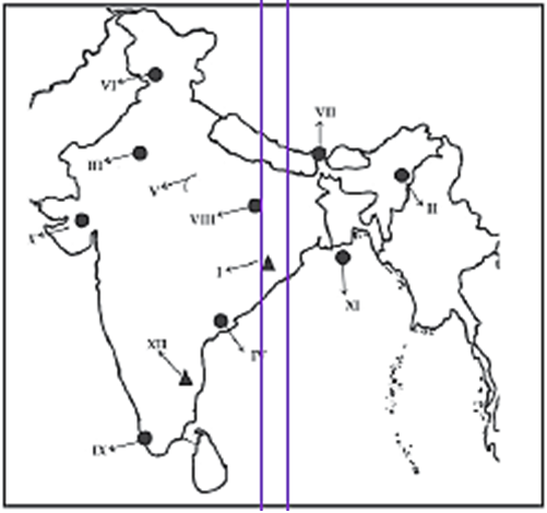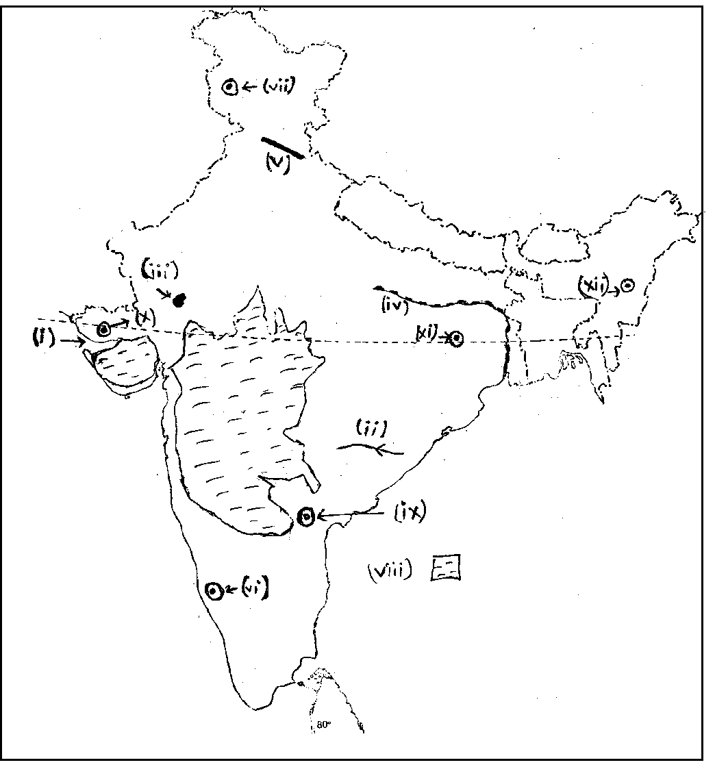 प्रश्न : आपको दिए गए भारत के रूपरेखा मानचित्र पर निम्नलिखित प्रविष्टियों में से किन्हीं दस को चिन्हित कीजिए और उनमें से प्रत्येक के महत्वपूर्ण पक्ष पर संक्षिप्त टिप्पणियां अधिक से अधिक 30 शब्दों में लिखिए।