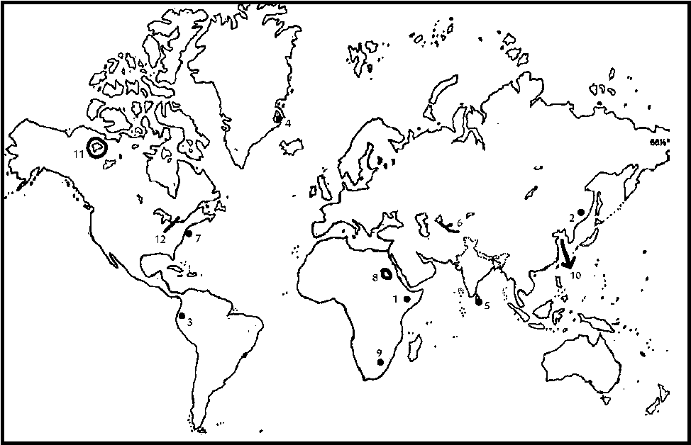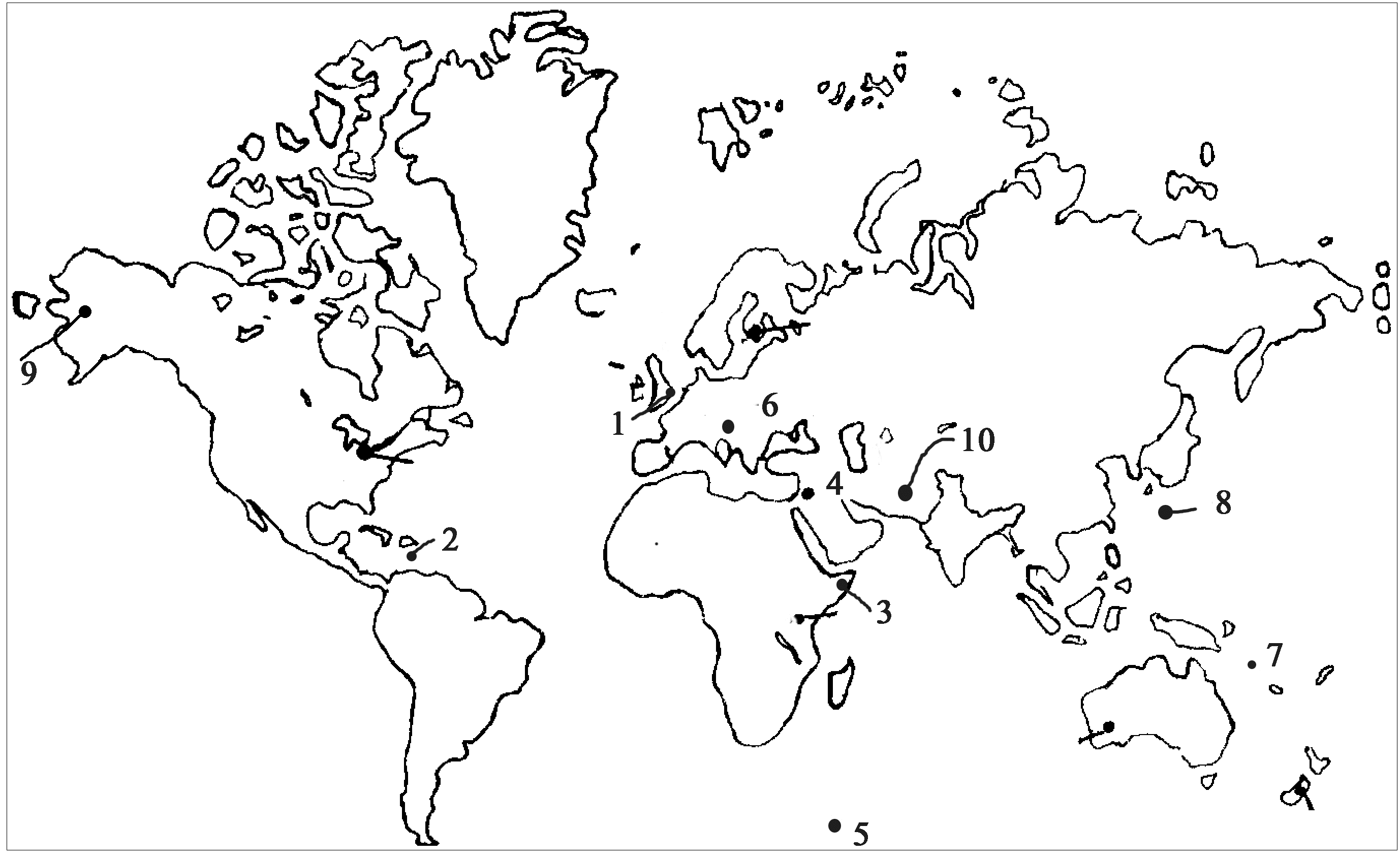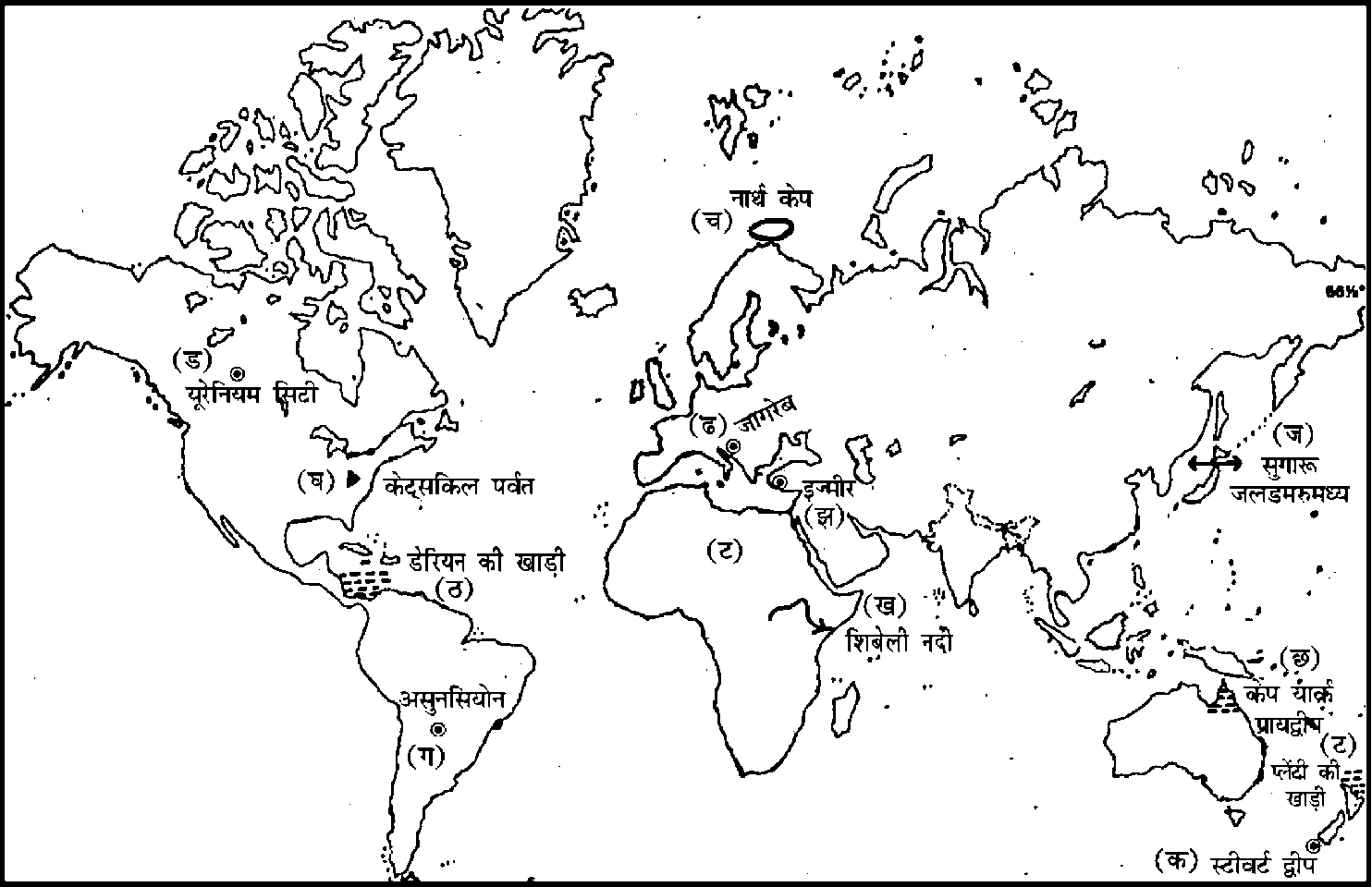 प्रश्न : आपको दिये गये संसार के रूपरेखा नक्शे पर निम्नलिखित में से किन्हीं दस के चिह्न लगाइये और अपनी उत्तर-पुस्तिका में उनमें से प्रत्येक के बारे में अधिकतम महत्वपूर्ण पक्ष को लिखिए, जो प्रत्येक मामले में दस शब्दों से ज्यादा का नहीं होना चाहिए।