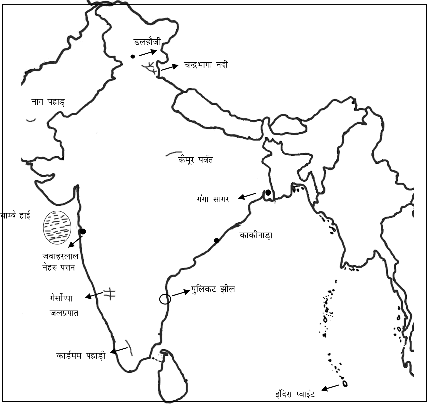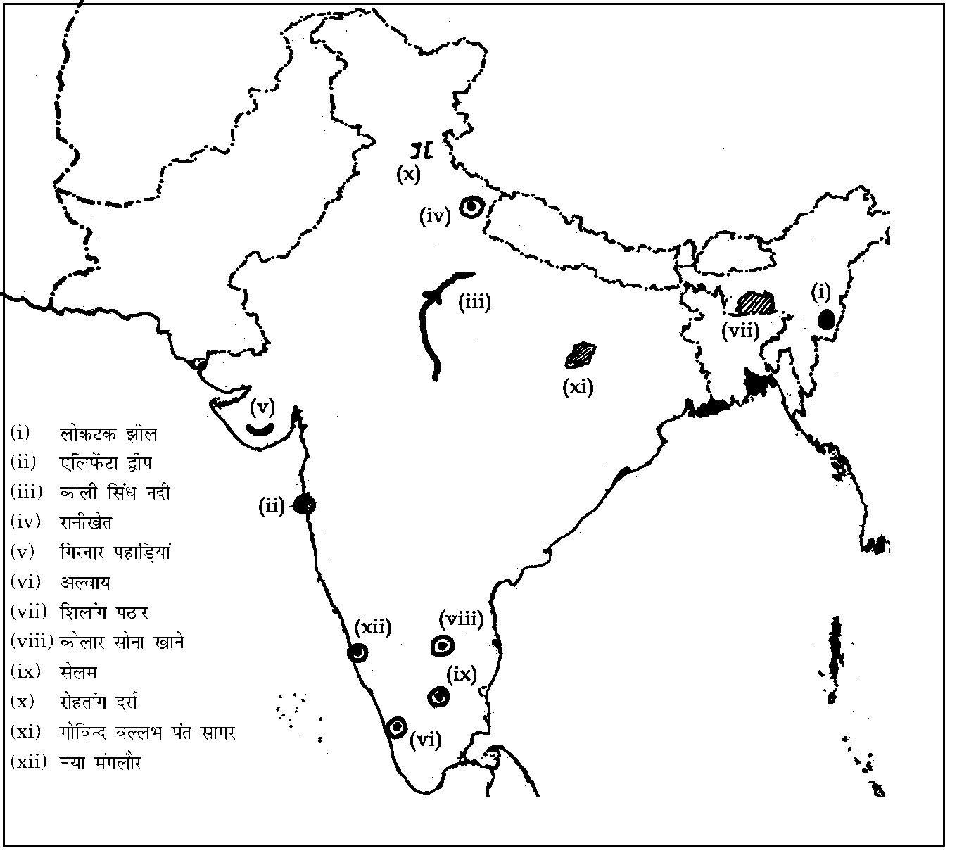 प्रश्न : आपको दिए गए भारत के रूपरेखा नक्शे पर निम्नलिखित प्रविष्टियों में से किन्हीं दस को चिह्नित कीजिए। प्रत्येक प्रविष्टि के सार्थक पक्षों पर संक्षिप्त टिप्पणियां (30 शब्दों से अधिक नहीं होनी चाहिए) भी लिखिए।