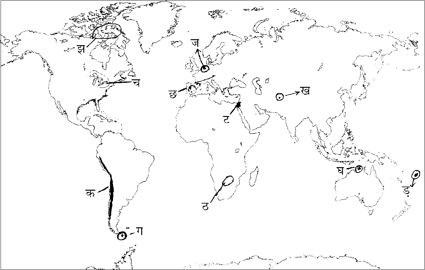 प्रश्न : दिये गये संसार के रेखा मानचित्र पर किन्हीं दस को चिह्नित कीजिए तथा अपनी उत्तर पुस्तिका में उनमें से प्रत्येक के बारे में उसके सर्वाधिक महत्वपूर्ण पहलू को अधिकतम दस शब्दों में लिखिए