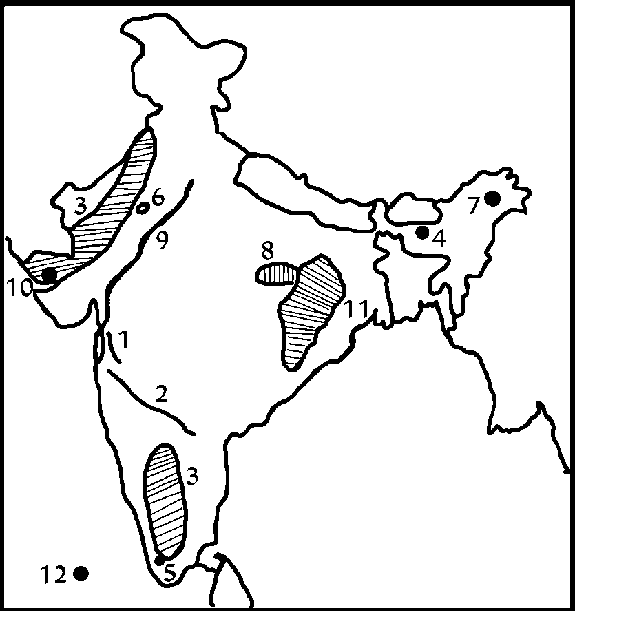 प्रश्न : आपको दिए गए भारत के रेखा-मानचित्र पर निम्नलिखित में से किन्हीं इस प्रविष्टियों को चिन्हित कीजिए। उन्हीं इस प्रविष्टियों के महत्वपूर्ण पक्षों पर संक्षिप्त टिप्पणियां (जो प्रत्येक 30 से ज्यादा शब्दों में न हो) भी लिखिएः