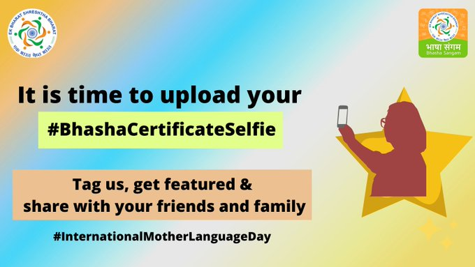 21 फरवरी, 2022 को शिक्षा मंत्रालय द्वारा ‘भाषा सर्टिफिकेट सेल्फी अभियान’ (Bhasha Certifiate Selfie campaign) का शुभारंभ किया गया है।