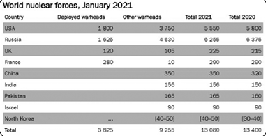 - वर्ष 2021 की शुरुआत में भारत के पास अनुमानतः 156 परमाणु हथियार थे, जबकि 2020 की शुरुआत में इनकी संख्या 150 थी।