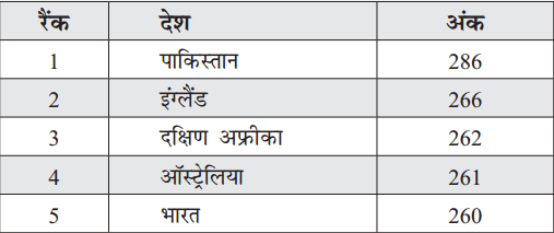 - वर्तमान में टी-20 रैंकिंग में 5 प्रथम टीमें निम्नलिखित हैं-