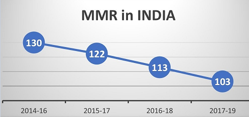 - देश में MMR में लगातार कमी देखी गई है। यह 2014-16 में 130, 2015-17 में 122 और 2016-18 में 113 से 2017-19 में 103 पर पहुँच गया है।