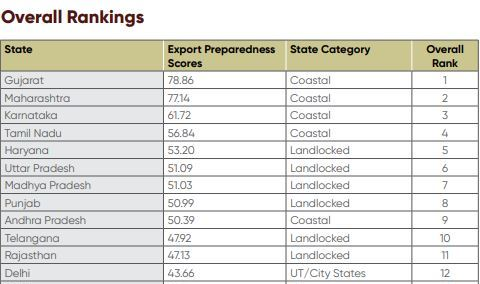 महत्वपूर्ण तथ्य: निर्यात तत्परता सूचकांक सभी राज्यों और केंद्र-शासित प्रदेशों को उनकी निर्यात तत्परता और प्रदर्शन के आधार पर रैंक करता है।