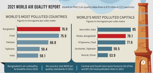 स्विट्जरलैंड स्थित वायु गुणवत्ता प्रौद्योगिकी कंपनी 'आईक्यूएयर' (IQAir) द्वारा जारी ‘विश्व वायु गुणवत्ता रिपोर्ट 2021’ के अनुसार बांग्लादेश दुनिया का सबसे प्रदूषित देश है।