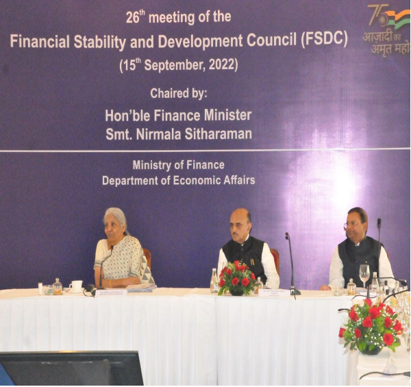 15 सितंबर, 2022 को वित्तीय स्थिरता एवं विकास परिषद (Financial Stability and Development Council) की 26वीं बैठक मुंबई में आयोजित की गई, जिसकी अध्यक्षता केन्द्रीय वित्त और कॉर्पोरेट कार्य मंत्री निर्मला सीतारमण ने की|