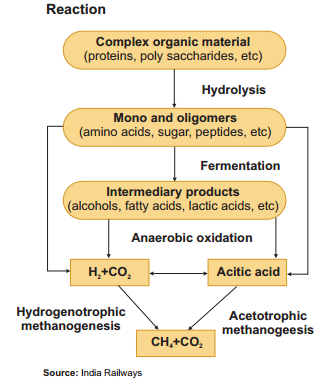 - The bacteria convert human faecal matter into water and small amount of gases (including methane) by process of hydrolysis, acetogenesis, acidogenesis and methanogenesis.