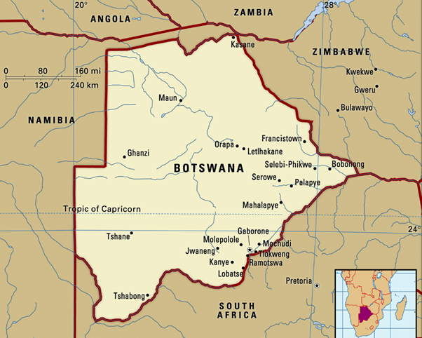 - Location/Unique Feature: Botswana is a landlocked country in Southern Africa, bordered by South Africa, Namibia, Zimbabwe and a short boundary with Zambia, dominated by the Kalahari Desert and the Okavango Delta, one of the world’s largest inland deltas.