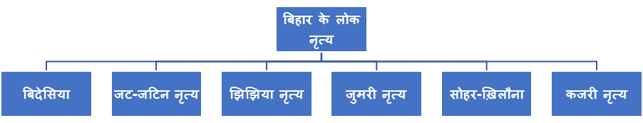 उत्तर: प्राचीनकाल से ही बिहार की समृद्ध सांस्कृतिक विरासत रही है। इसमें बिहार के लोक नृत्यों का विशेष स्थान है जो जन मानस में उल्लास भरने के साथ ही जीवन में एक नए उत्साह का संचार करते हैं। बिहार के प्रमुख लोक नृत्य निम्नलिखित हैं: