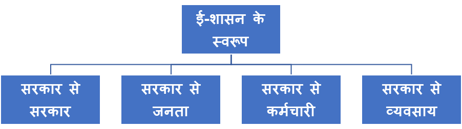 उत्तर: सरकार द्वारा विभिन्न प्रकार की सूचना एवं सेवाएँ प्रदान करने के लिये संचार एवं सूचना प्रौद्योगिकी का समन्वित प्रयोग करना, ई-शासन कहा जाता है। ई-शासन की सहायता से प्रदान की जाने वाली सेवाओं की गुणवत्ता भी बेहतर होती है। वर्तमान में ई-शासन के कई स्वरूप प्रचलित हैं, जिनमें निम्नलिखित प्रमुख हैं-