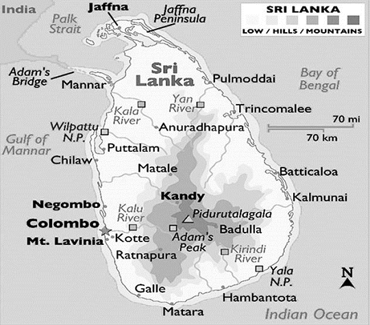 - हिंद महासागर में स्थित श्रीलंका को ‘पाक जलडमरूमध्य’ प्रायद्वीपीय भारत से अलग करता है। इसकी समुद्री सीमाएं उत्तर-पश्चिम में भारत तथा दक्षिण पश्चिम में मालदीव के साथ साझा होती हैं।