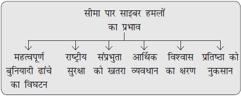 - राष्ट्रीय सुरक्षा: सीमा पार साइबर हमले के तहत सरकारी एजेंसियों, रक्षा प्रतिष्ठानों और महत्वपूर्ण बुनियादी ढांचे को लक्षित किया जाता हैं। इसके माध्यम से अक्सर सैन्य और रणनीतिक डेटा सहित संवेदनशील जानकारी को चुराया जाता ....