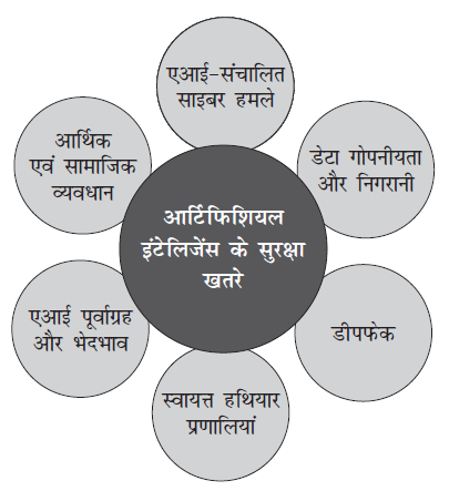 - हालाँकि, एआई प्रौद्योगिकियों को भारत सहित वैश्विक स्तर पर तेजी से अपनाया जा रहा है परंतु व्यापक रूप से अपनाए जाने से कई सुरक्षा खतरे भी उत्पन्न होते हैं।